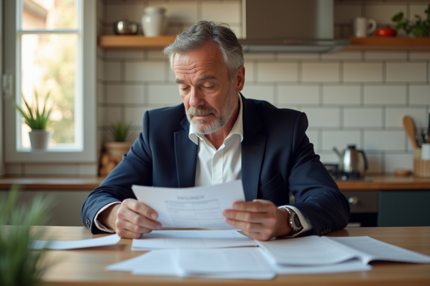 Homme d'âge moyen lisant des documents immobiliers dans une cuisine moderne